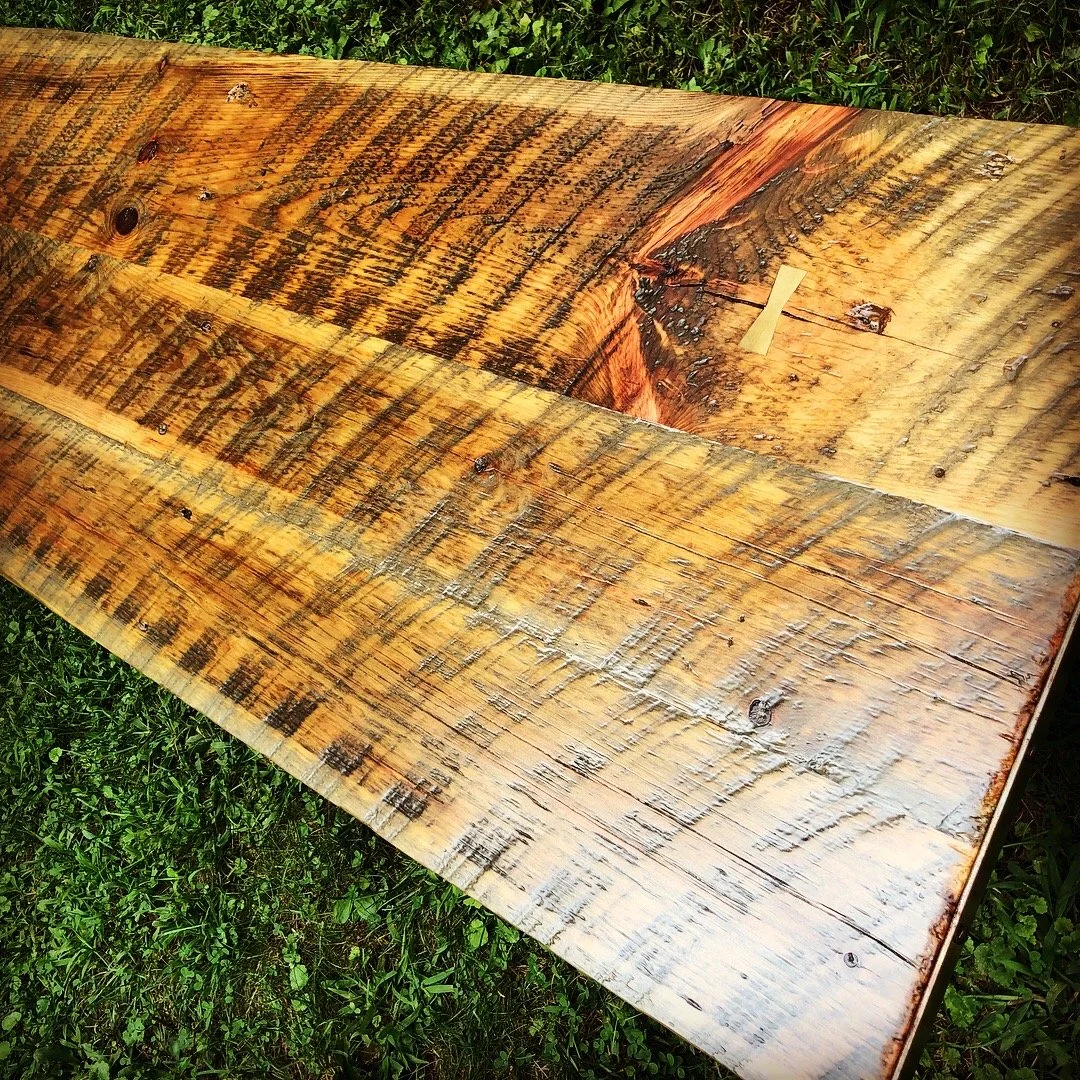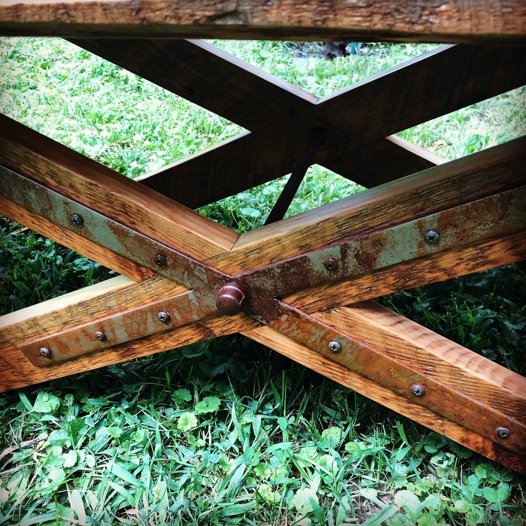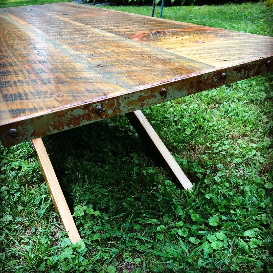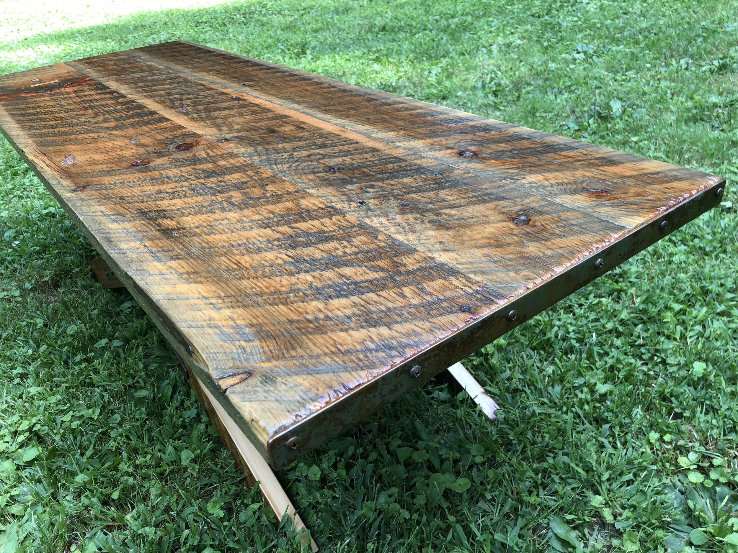 Custom reclaimed barn wood cabin table. This beautiful coffee table was made with barn boards taken from a 19th century barn located in Easton MA. along with custom distressed metal work in keeping with the rustic nature of the piece. It fits perfectly in the customers Maine cabin.