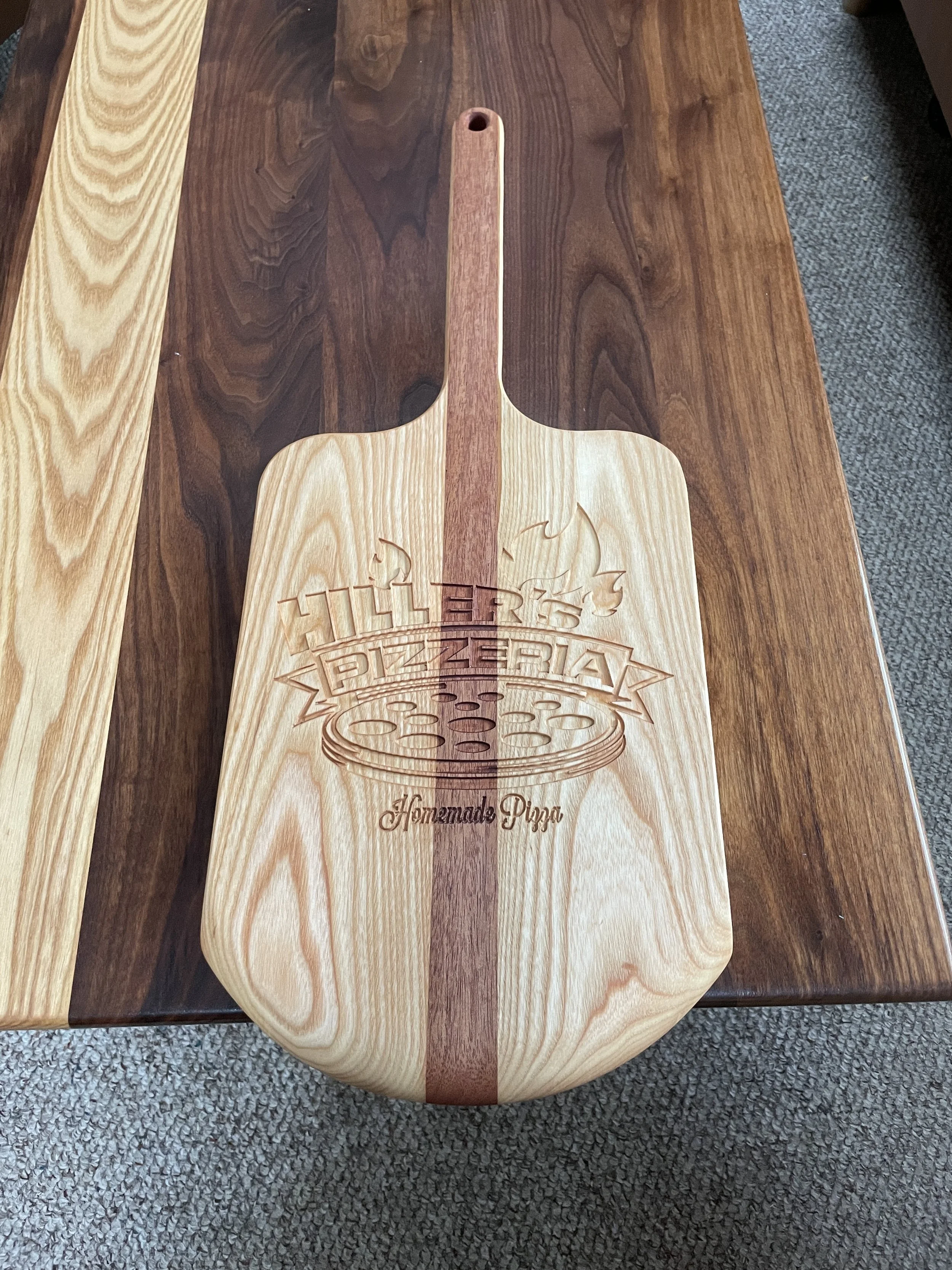 Personalized Pizza Peel with original pizzeria custom logo.